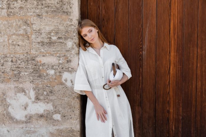- Stwórz casualowy look, zestawiając koszulową sukienkę z jeansową kurtką, sneakersami i torebką na ramię.